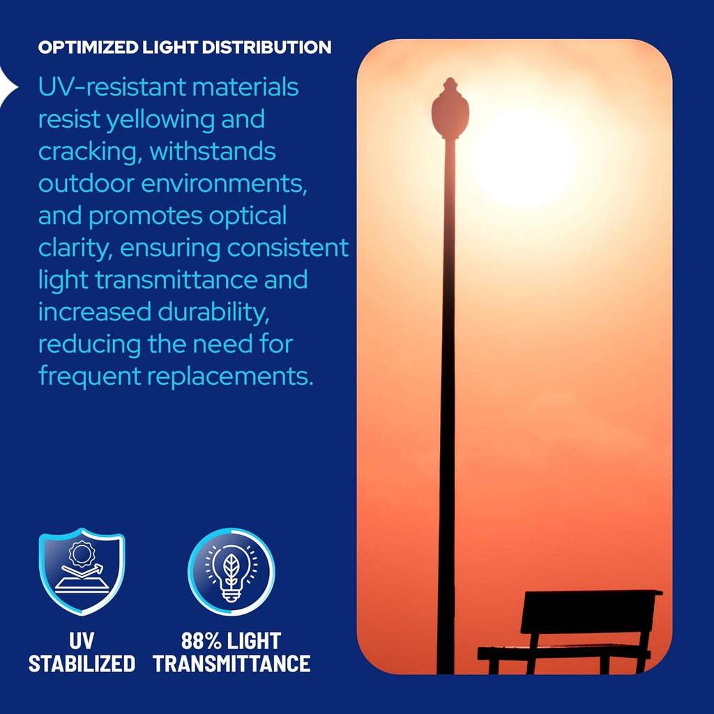 THE IDEAL LIGHT COVER: Polycarbonate material is UV stabilized with a continuous operating temperature of 100 - 125C and transmittance of 88%. One piece injection blow-molded.