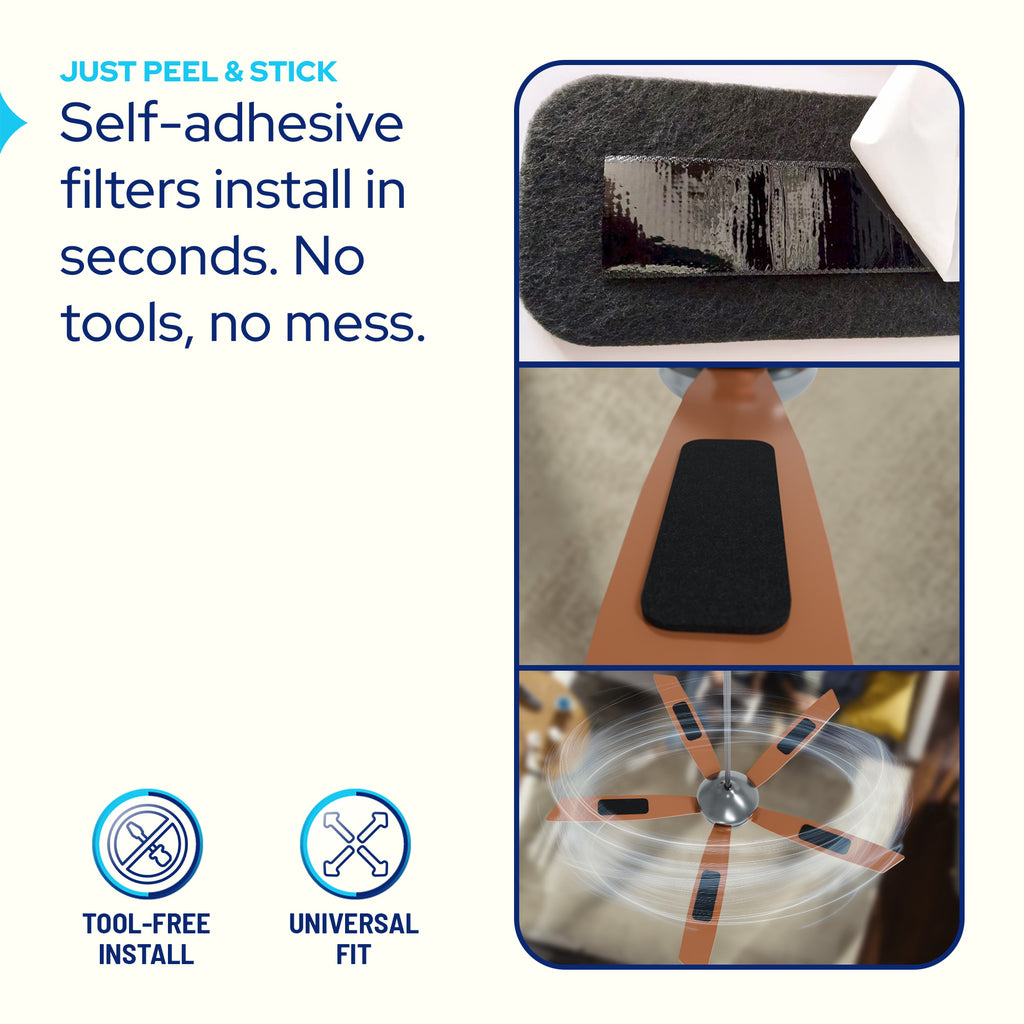 No tools or cords needed—just peel and stick. These fan filters for ceiling fan blades fit most ceiling fans and install in seconds. Great for apartments, nurseries, rentals, and dorm rooms.