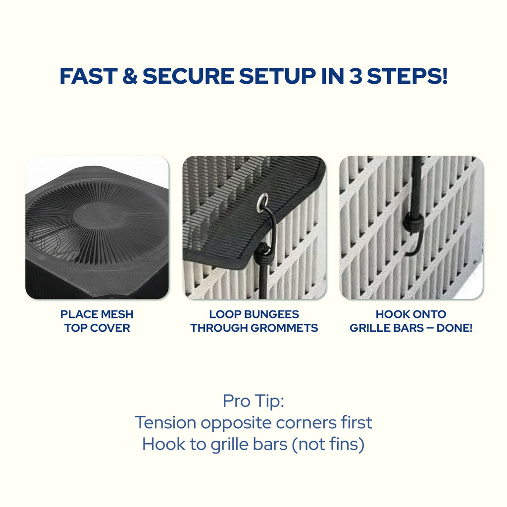 - UNIVERSAL SIZE: The mesh air conditioner cover (36" x 36") fits most units—choose larger for overlap. Includes top AC mesh cover for outside unit + 4 bungees.