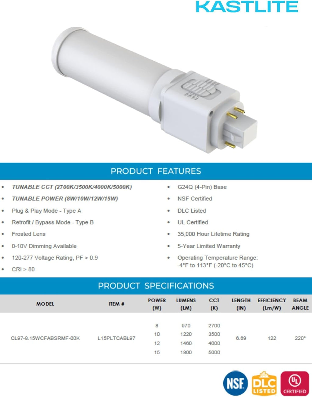 Type A+B 8W/10W/12W/15W 2700K-5000K 970-1800LM CFL Replacement 4 Pin Light Bulb - Compact Fluorescent Light Retrofit Lamp for Recessed Lighting Fixtures, L15PLTCABL97