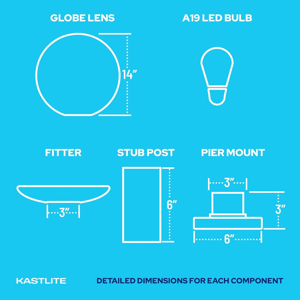 - FULL LIGHTING SOLUTION: Easily upgrade your outdoor lighting with this all-in-one solution. Including a globe shade, fitter, 4000K A19 bulb and 6" stub post pier mounting base for stylish attachment to walls, posts and other flat applications, you can achieve a sleek, modern look with ease. Please choose your size carefully as a restock fee will be applied to buyer-at-fault returns.