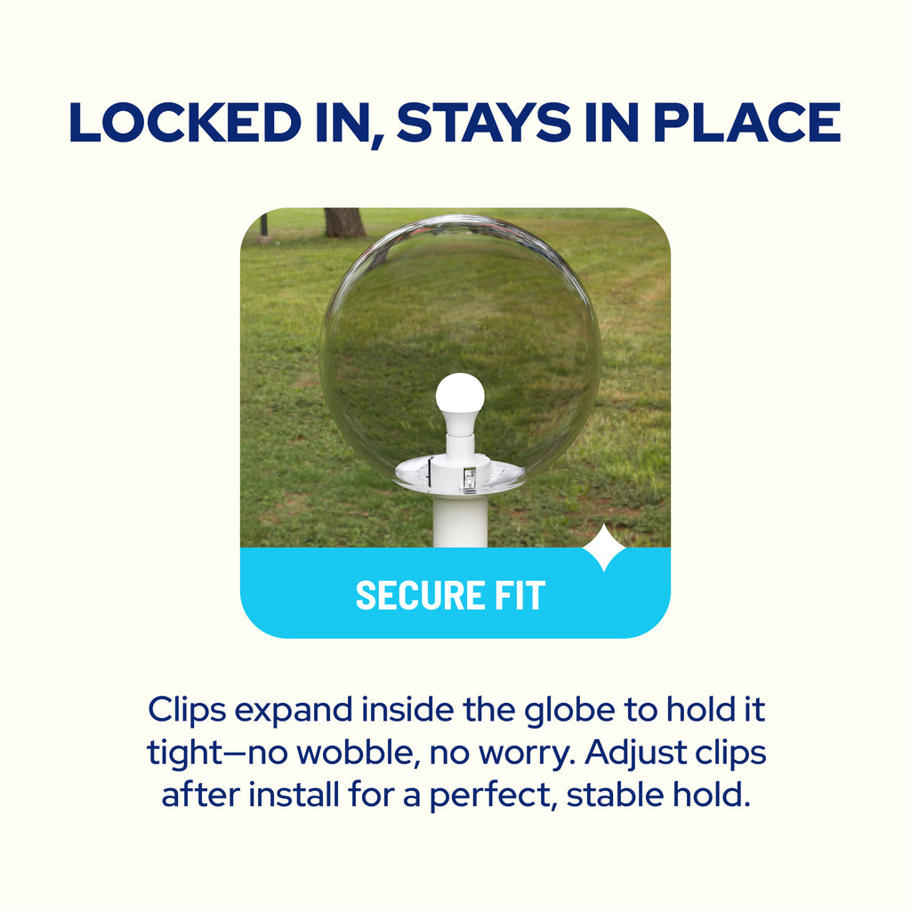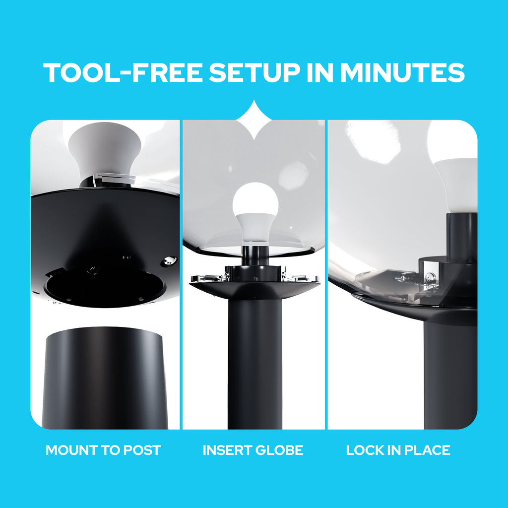 SECURE MOUNTING: No tools needed—just a firm hold. This lamppost light fixture base uses wing clips to lock globes or acorns in place. Your outdoor lamp post light fixture stays secure through wind and weather.